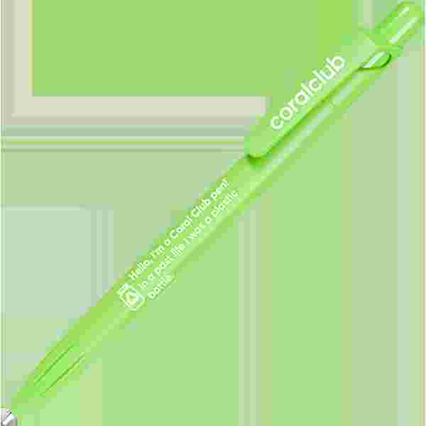Ballpoint pen with push-button mechanism made of PET-RECYCLED material with the inscription "Hello, I'm a Coral Club pen! In a past life I was a plastic can."